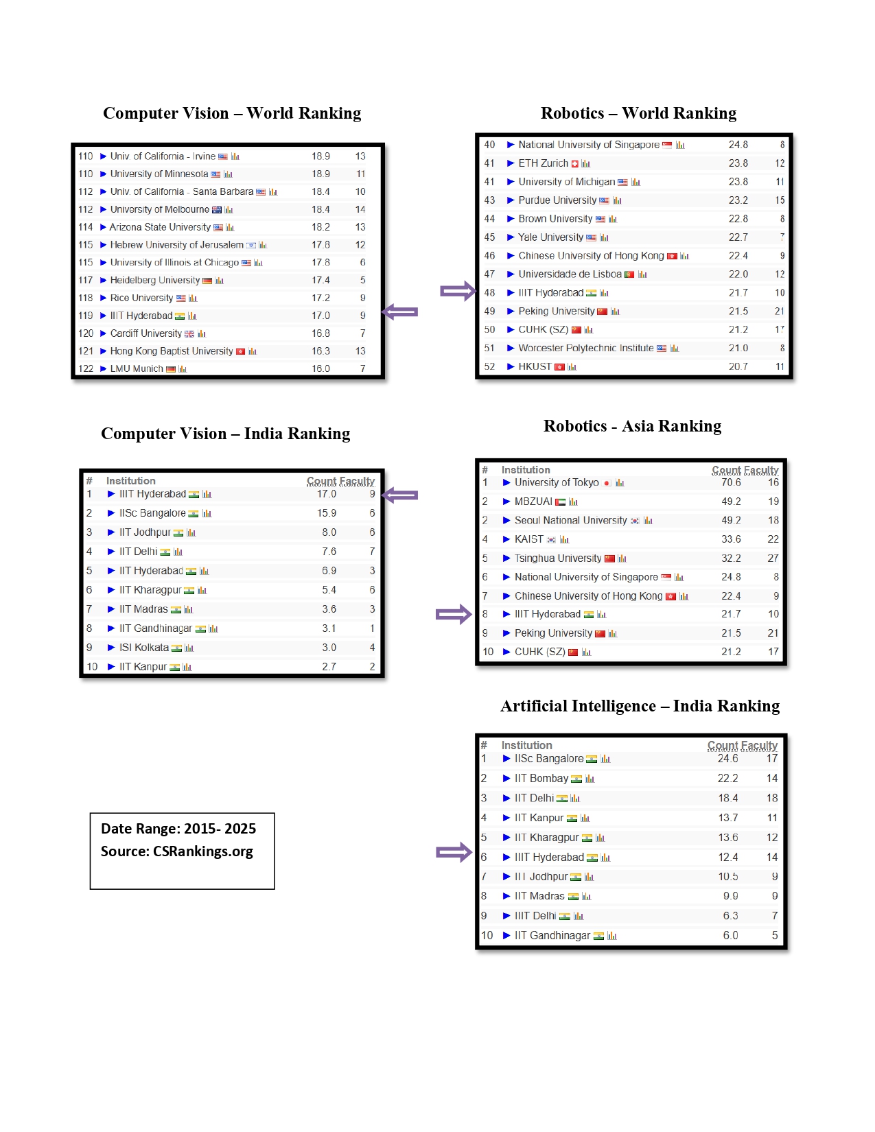 In many areas we are ranked high within the country and internationally. 119 in the world in CV and 1st in the country. 48th in the world in Robotics and 8th in Asia and 1st in India. In core Artificial Intelligence we are ranked 6th in India.